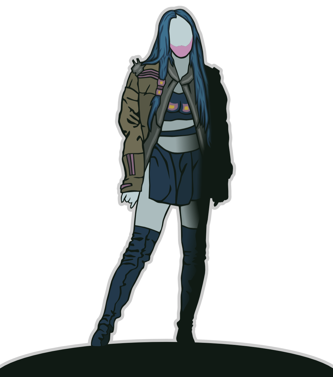 Farbe: Hellblaue Haut, dunkles Haar, gelbe Augen
