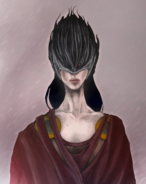 Die Tebe Qiylin Dieson in ihrer Galamaske – Der ›Irritierer‹ auf der linken Maskenseite sendet einen psionischen Schock in die Augen eventueller Widersacher und hindert diese daran schnell und effektiv zu handeln.